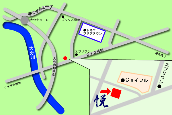 ジョイフルさん入り口に看板が出ております。お車は『悦』駐車場をご利用ください。